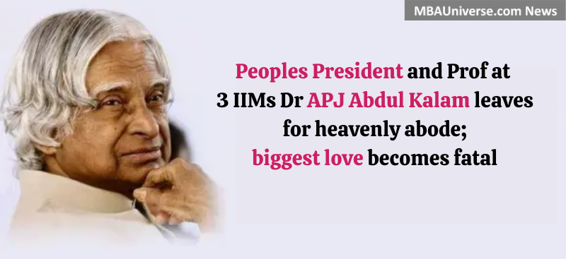Bharat Ratna Dr APJ Abdul Kalam, the 11th President of India and popularly known as Missile Man and Peoples President passed away on July 27, 2015 after getting a severe cardiac arrest while in interaction with the students at Indian Institute of Management (IIM) Shillong. He was 83 years old and was to celebrate the next Birthday on October 15, 2015. Post Presidency he served as visiting professor at 3 IIMs. Sudden demise of Dr Kalam is a great loss for the country and for MBA students at IIM Ahmedabad, Indore and Shillong where he was the visiting Professor. Students of these institutes frequently got the opportunity of learning great lessons from the learned former President of India.