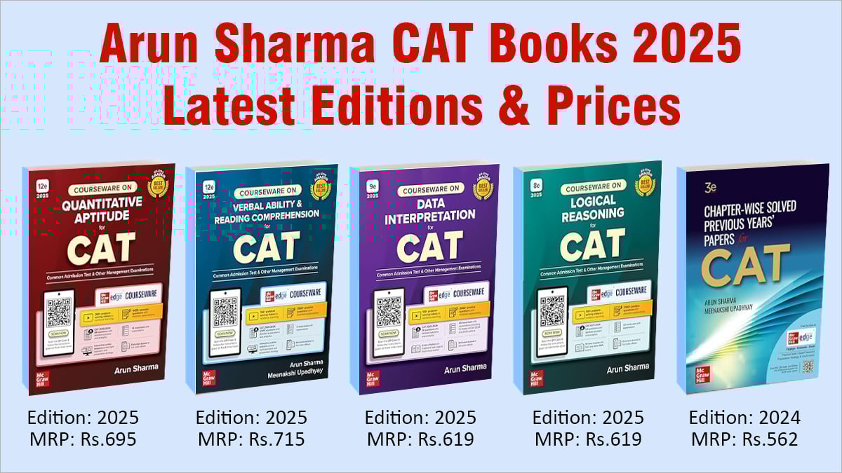 CAT 2025 exam will be held on November 30, 2025. To prepare for CAT exam, Arun Sharma CAT books have been widely used by CAT toppers for last 15 years. From 2025 onwards, Arun Sharma’s bestselling CAT preparation books are converted as ‘Courseware’, that combines traditional books with digital learning tools like videos and mock tests. For example, Arun Sharma Quantitative Aptitude for CAT 2025 (12th Edition) include print edition of the book along with 4000+ practice questions, 200+ videos, and solved CAT 2023–24 papers. Similarly, Arun Sharma Verbal Ability and Reading Comprehension for CAT 2025 (12th Edition) include print edition of the book along with new questions, videos, and new sectional tests. Arun Sharma CAT Books on Logical Reasoning and Data Interpretation have also been totally revised for CAT 2025. With no increase in price despite these value additions, these books and courseware offer aspirants strong value. Read this article to check Arun Sharma CAT Books 2025 latest edition, prices, chapters and topics, cost and discounts. Also know about Arun Sharma CAT books 2025 PDF free download. The article also includes honest Arun Sharma CAT book reviews by CAT Toppers.