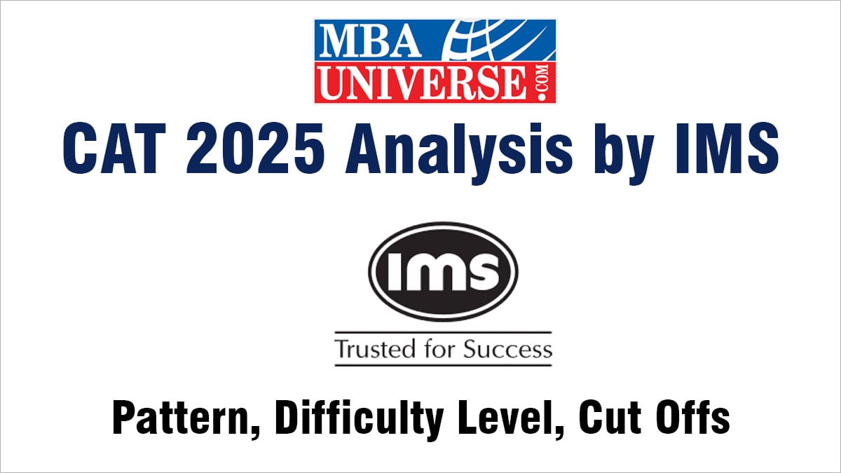 CAT 2025 analysis by IMS Coaching will be published on MBAUniverse.com on CAT 2025 Exam Date - November 30, 2025. CAT 2025 exam paper analysis by IMS includes in-depth analysis of CAT Exam Pattern, Type of Questions asked, Difficulty level, Good attempts, Surprises and more details. Based on this analysis, IMS CAT Score Vs Percentile and IMS CAT Cut Offs will also be published. IMS Coaching is one of the most reputed CAT coaching institute in India. Check details of CAT exam analysis and CAT previous year paper analysis by IMS Coaching.