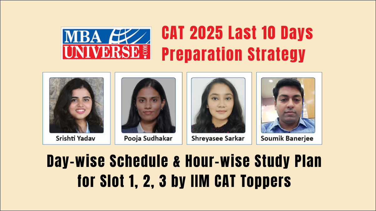 CAT 2025 exam, to be held on November 30, 2025 is now just a few days ways! Many students are worried due to low mock scores in recent attempts, and are feeling demotivated and stressed. Indeed, getting the CAT last 10 days preparation strategy right is crucial, and can make a big difference to final CAT score. MBAUniverse.com interviewed 10 CAT Toppers who are now studying at top IIMs, SPJIMR, and MDI to prepare this special article on CAT 2025 last 10 days preparation strategy. The article includes CAT Day-wise for 10 days to CAT and topper tips. It also includes CAT Hour-wise Study Schedule for Slot 1, Slot 2, and Slot 3 that is designed to help you balance Mocks, Revisions, Body Clock Adjustment, Nutrition, and Stress Management. So, read this article carefully and get ready to for your peak performance in CAT 2025!