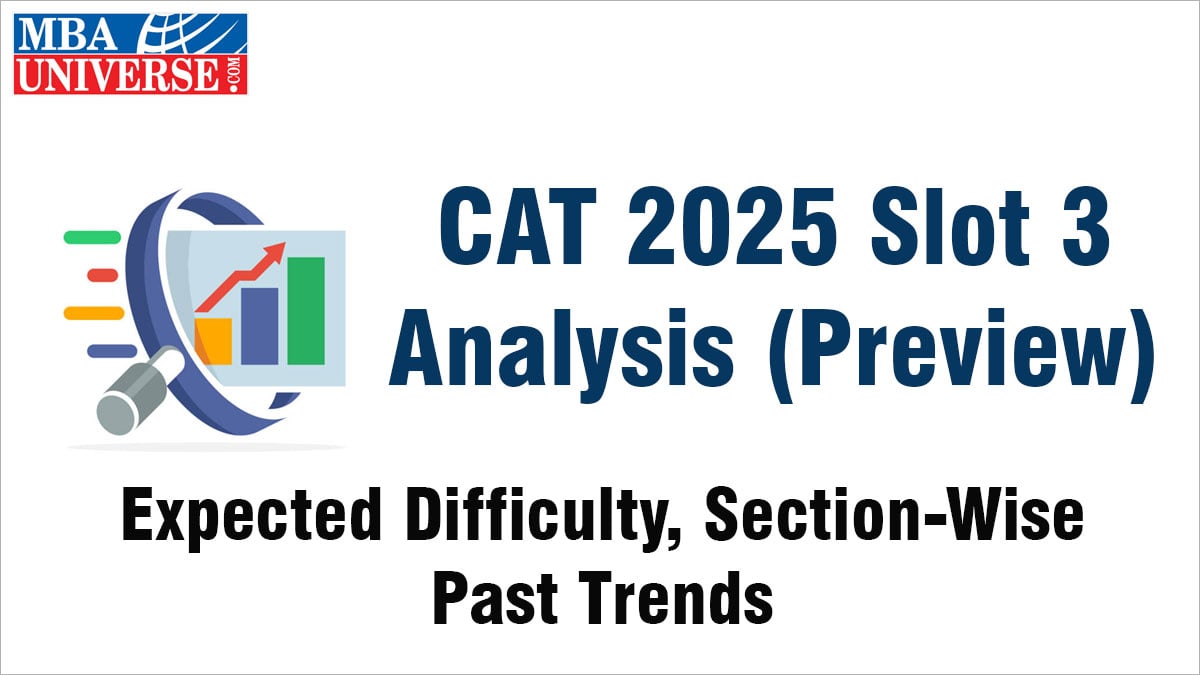 CAT 2025 exam will be held on November 30, 2025. MBAUniverse.com will publish the complete CAT 2025 Slot 3 Analysis on exam day immediately after the exam paper ends. The analysis will include section-wise difficulty level, question patterns, changes from previous years, and expected score Vs percentile predictions. Read CAT 2025 Slot 3 exam details, along with previous years’ CAT 2024 Slot 3 analysis and CAT 2023 Slot 3 analysis. Also download CAT 2025 Slot 3 analysis PDF from the links below. Live Now: CAT Cut Offs 2025, CAT Score vs Percentile 2025 and CAT Percentile Predictor 2025.