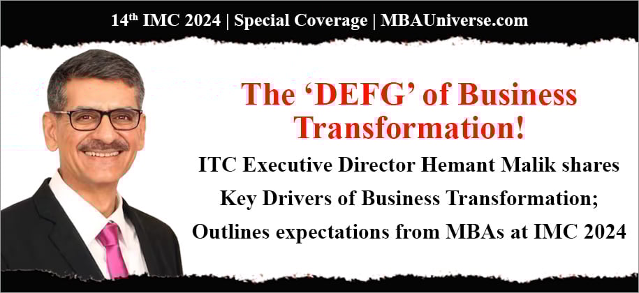 The business landscape is undergoing a rapid transformation. Stupendous success of digital-natives is forcing traditional corporations to adopt new ways to conceive, capture, communicate and deliver value. Accordingly, the expectations from MBA graduates are also changing. India’s leading CEOs and CXOs spoke on this theme at 14th Indian Management Conclave. Mr Hemant Malik, Executive Director, ITC Ltd shared the key drivers of business transformation -- which he conceptualized as ‘DEFG’. He also outlined the changing corporate expectations from MBAs at IMC 2024.