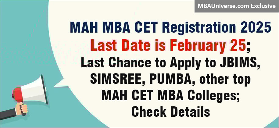 MAH MBA CET Registration Last Date is February 25, 2025. Conducted by Maharashtra State Government’s CET Cell of Directorate of Technical Education (DTE), MAH MBA/MMS CET 2025 is the MBA entrance exam for admission in JBIMS, SIMSREE, PUMBA and 300+ MBA colleges in Mumbai, Pune and other cities. MAH MBA CET Exam 2025 will be held on April 1, 2, 3, 2025 across India. Read how to fill MAH CET Registration and application form, fees, and why you should register for MAH MBA CET Exam 2025?